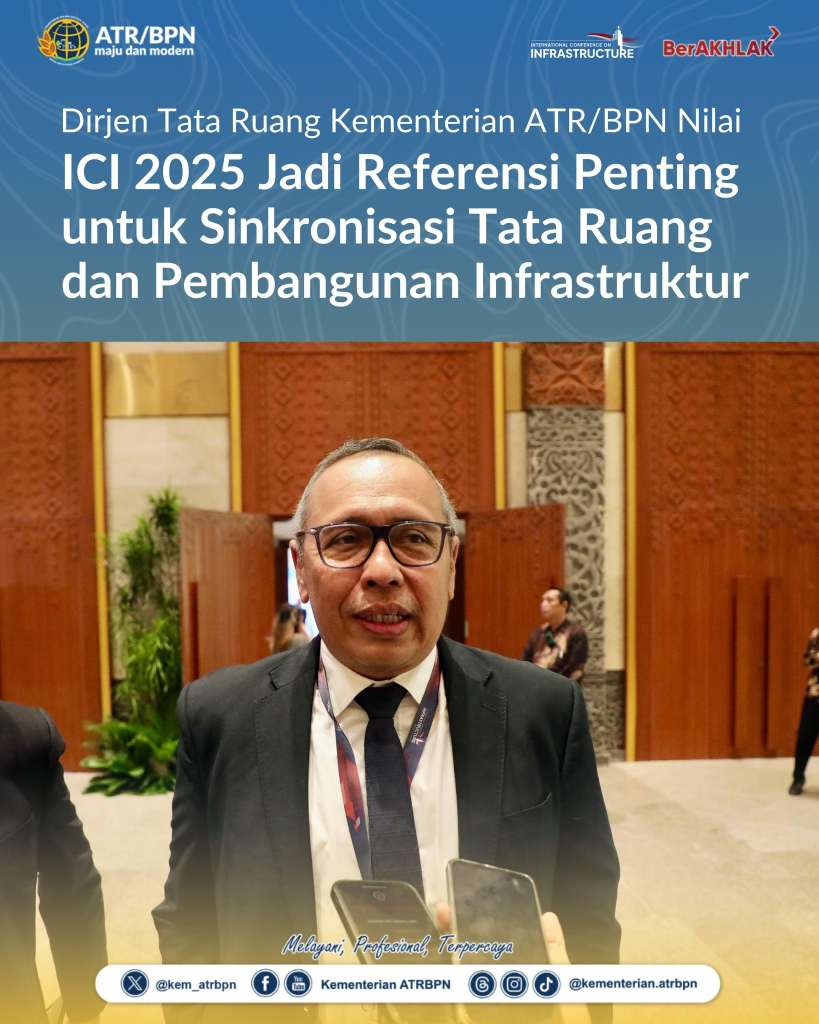 Jakarta – Direktur Jenderal (Dirjen) Tata Ruang Kementerian Agraria dan Tata Ruang/Badan Pertanahan Nasional (ATR/BPN), Suyus Windayana menilai pelaksanaan International Conference on Infrastructure (ICI) 2025 sebagai momen penting untuk merumuskan arah pembangunan nasional yang terintegrasi dengan tata ruang. Hal tersebut ia sampaikan usai menghadiri Pembukaan ICI 2025 di Jakarta International Convention Center, Rabu (11/06/2025).